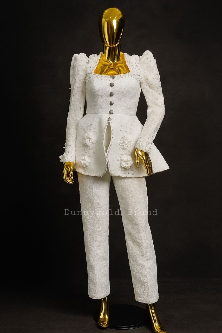 White Embellished Structured Peplum Suit Set- Inspired by Dunni Gold
