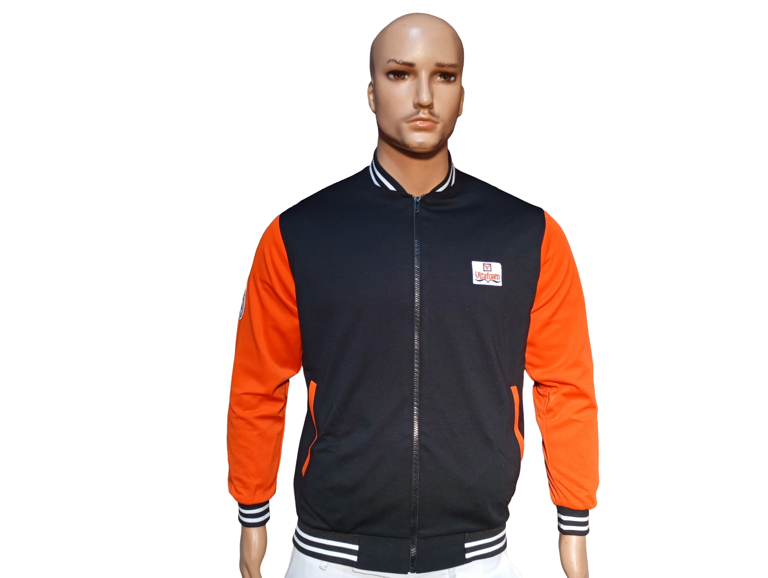 This stylish varsity jacket combines modern fashion with functional comfort. Featuring a black body with bold orange sleeves, it carries the Vitafoam embroidered logo on the chest and a patch detail on the sleeve. The ribbed cuffs, hem, and collar with black-and-white stripes give it a classic sporty look. Perfect for branding, events, or casual wear.